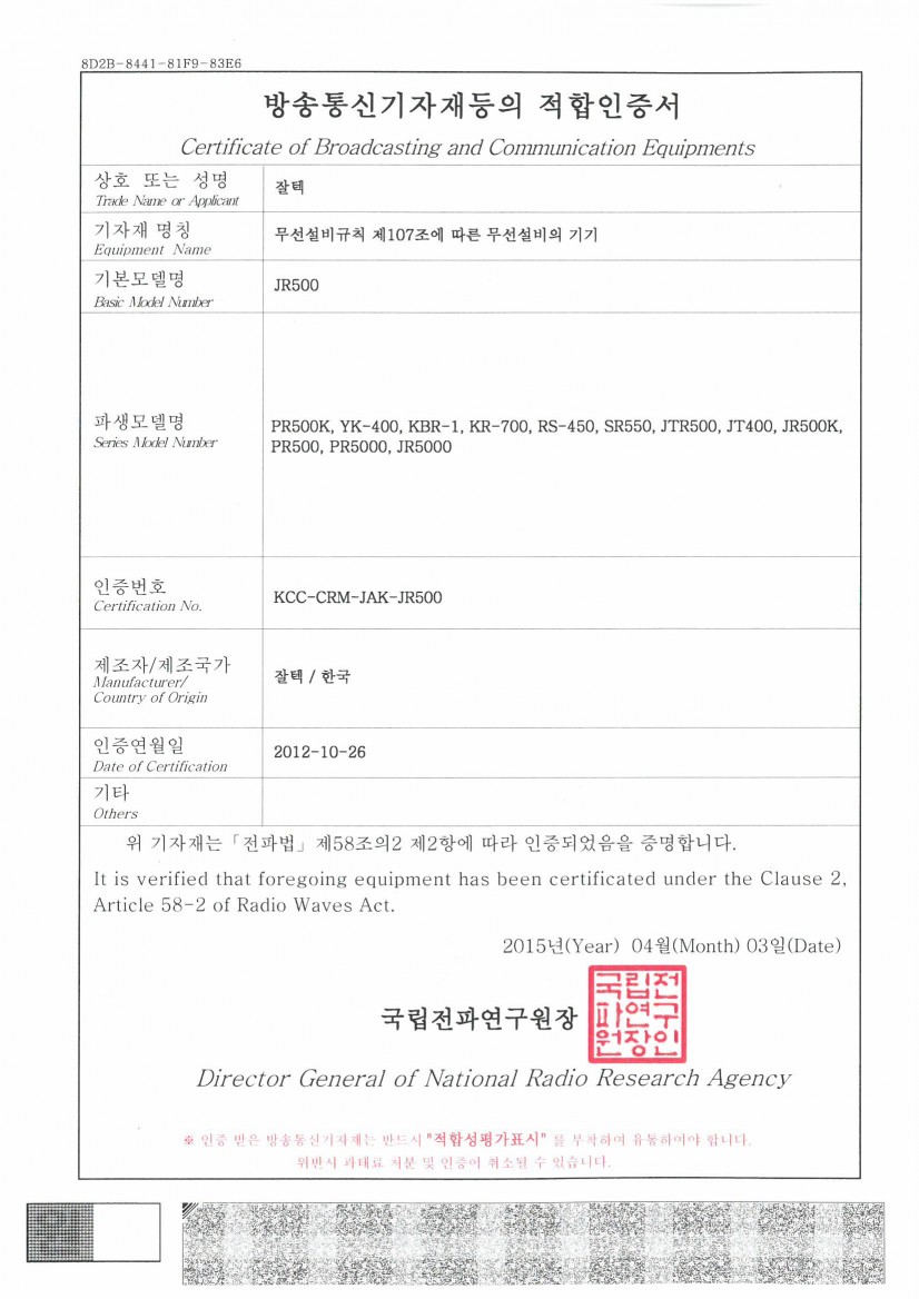 목록 [기타] 제품 인증서(JR-500 SERIES) 작성자 잘텍 작성일 17-05-15 10:16 | 조회 56,719 | 댓글 0 본문 JR-500SERIES 이전글다음글 댓글목록 0 등록된 댓글이 없습니다. 목록